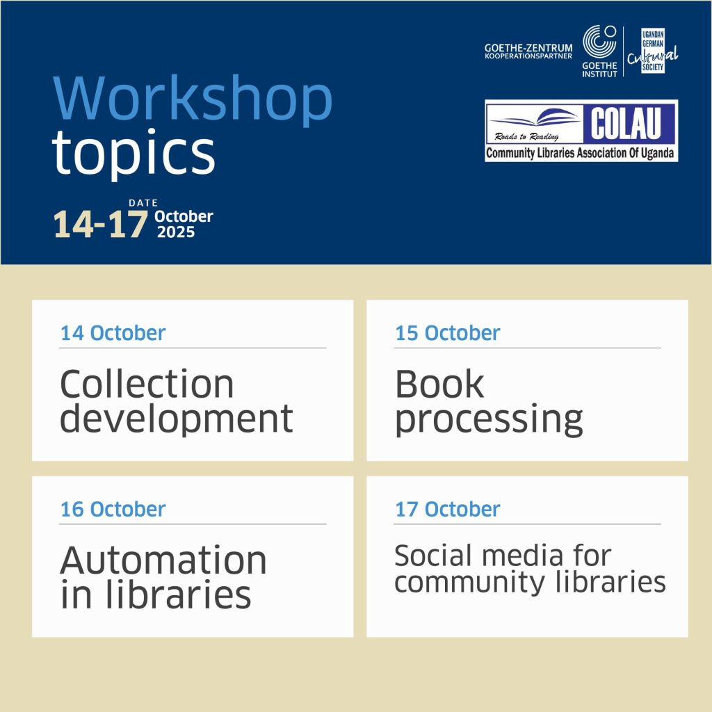 The Goethe-Zentrum Kampala (GZK) / Ugandan German Cultural Society Library , in partnership with the Community Libraries Association of Uganda (COLAU), successfully concluded a four-day Library Capacity Building Workshop designed to equip community librarians with essential skills in collection development, book processing, library automation and social media management.