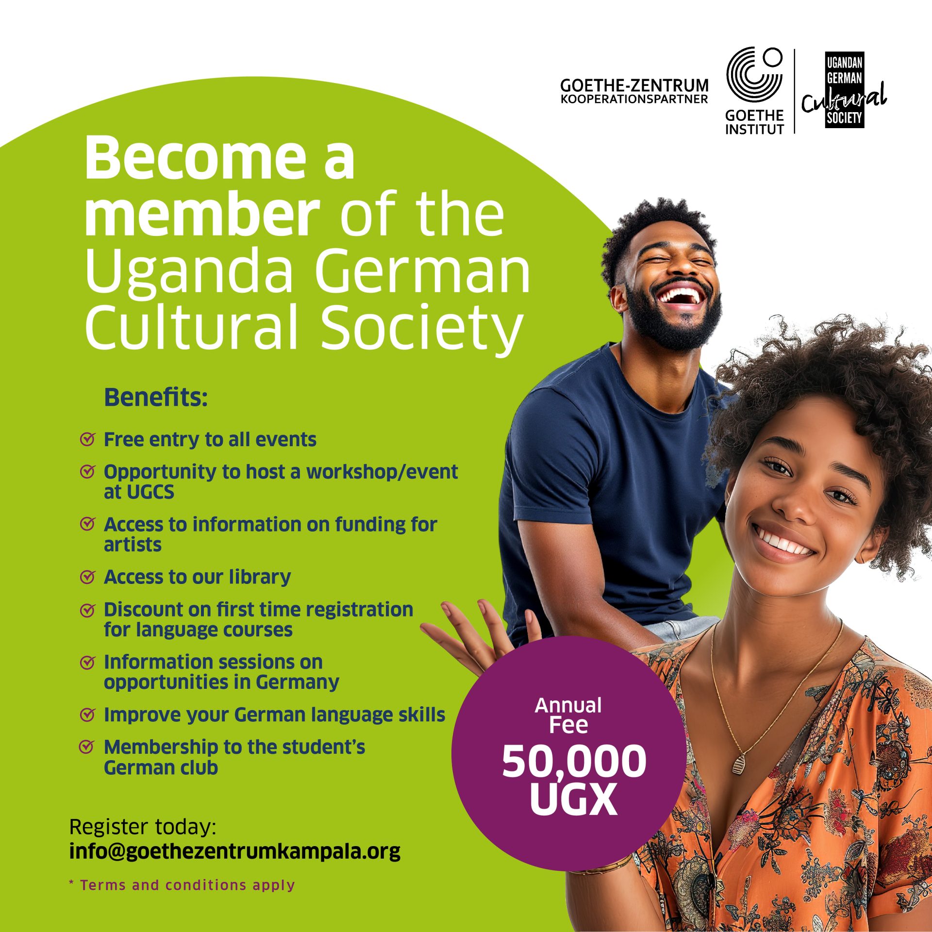 T & C: This benefit applies exclusively to events organized and hosted by the Uganda German Cultural Society/Goethe-Zentrum Kampala. Partner events hosted at our venue qualify for a 10% discount on admission fees (where applicable).